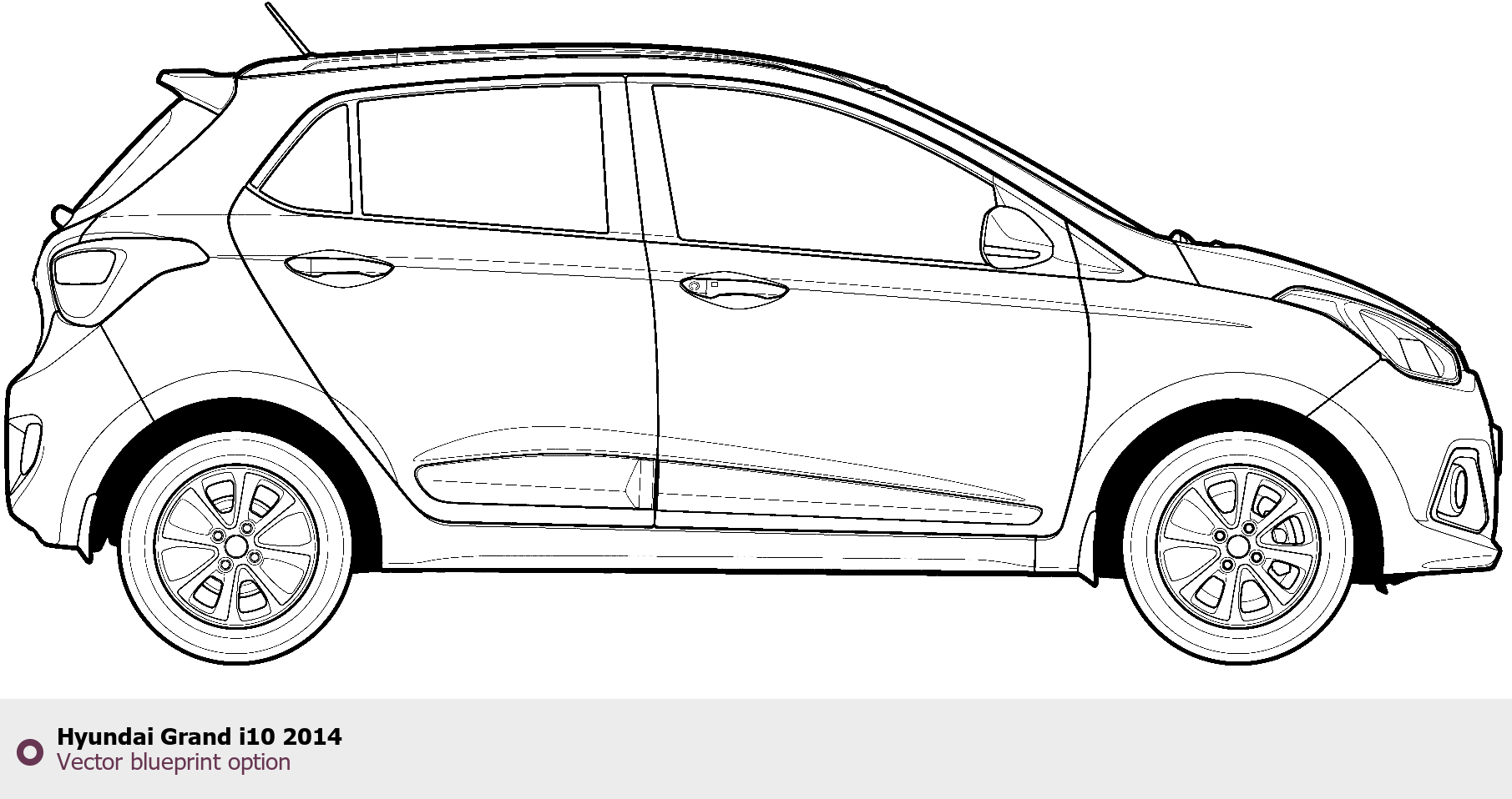 Raster blueprint of the 2014 Hyundai Grand i10 Hatchback. This free downloadable image can be used for graphic projects, digital design, and 3D modeling. The file provides accurate exterior proportions of the vehicle. Model year: 2014. Body type: Hatchback.