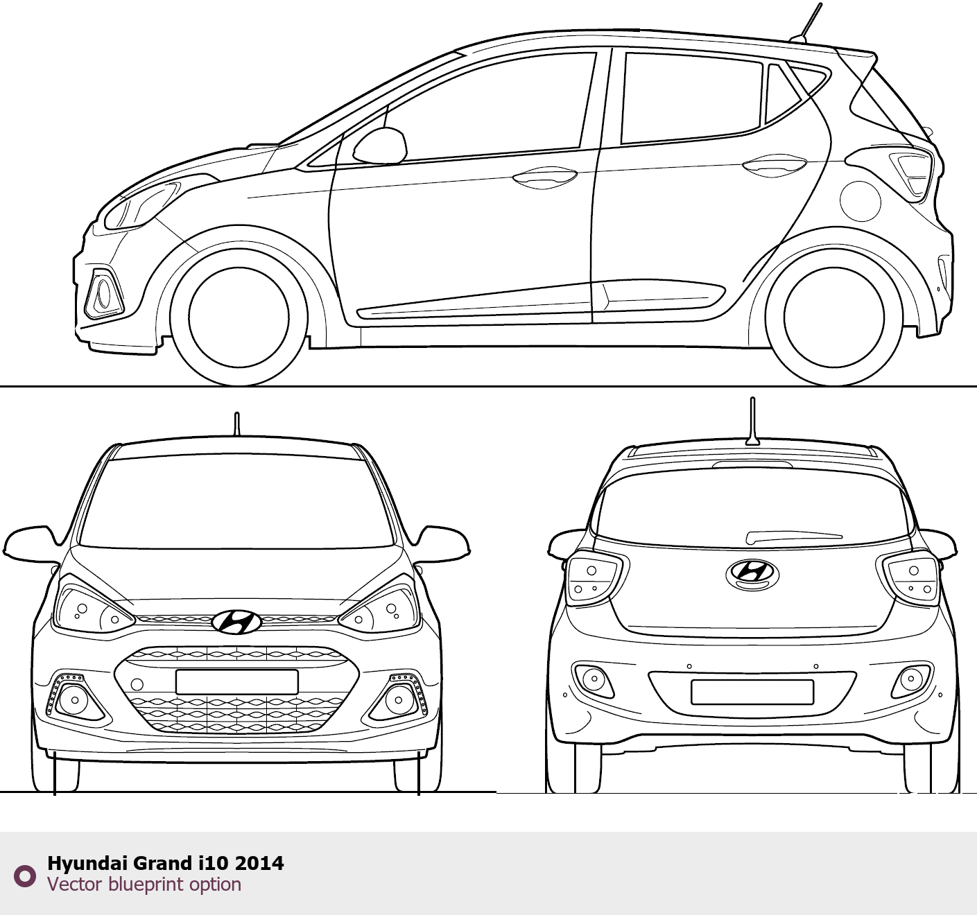 Raster blueprint of the 2014 Hyundai Grand i10 Hatchback. This free downloadable image can be used for graphic projects, digital design, and 3D modeling. The file provides accurate exterior proportions of the vehicle. Model year: 2014. Body type: Hatchback.