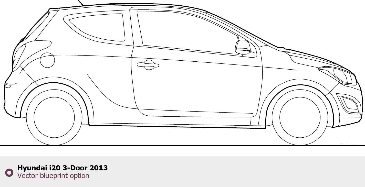 Raster blueprint of the 2013 Hyundai i20 3-Door Hatchback. This free downloadable image can be used for graphic projects, digital design, and 3D modeling. The file provides accurate exterior proportions of the vehicle. Model year: 2013. Body type: Hatchback.