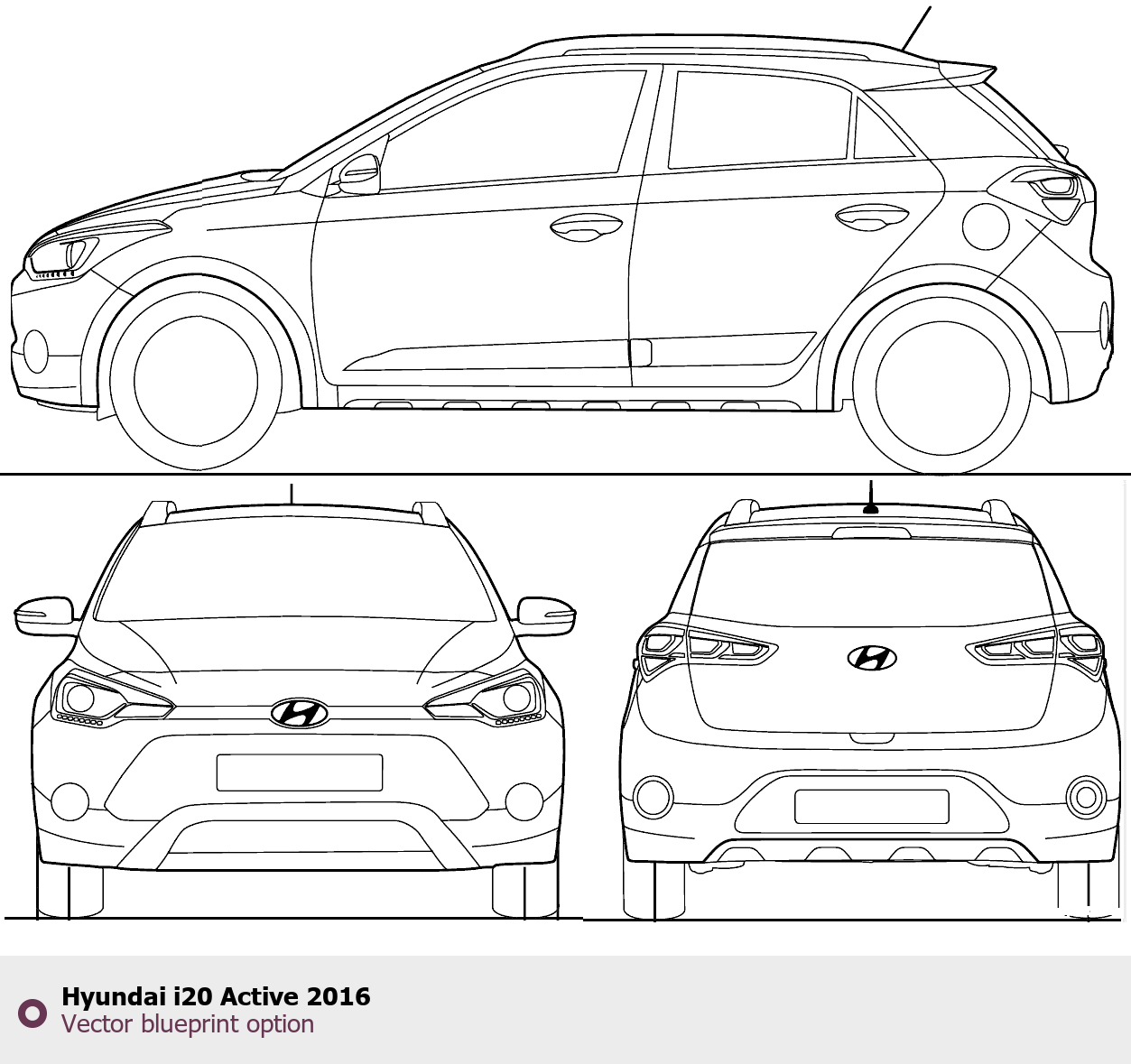 Raster blueprint of the 2016 Hyundai i20 Active Hatchback. This free downloadable image can be used for graphic projects, digital design, and 3D modeling. The file provides accurate exterior proportions of the vehicle. Model year: 2016. Body type: Hatchback.