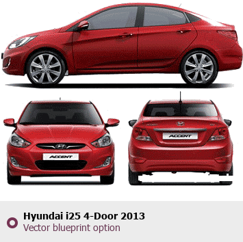 Raster blueprint of the 2013 Hyundai i25 4-Door Sedan. This free downloadable image can be used for graphic projects, digital design, and 3D modeling. The file provides accurate exterior proportions of the vehicle. Model year: 2013. Body type: Sedan.