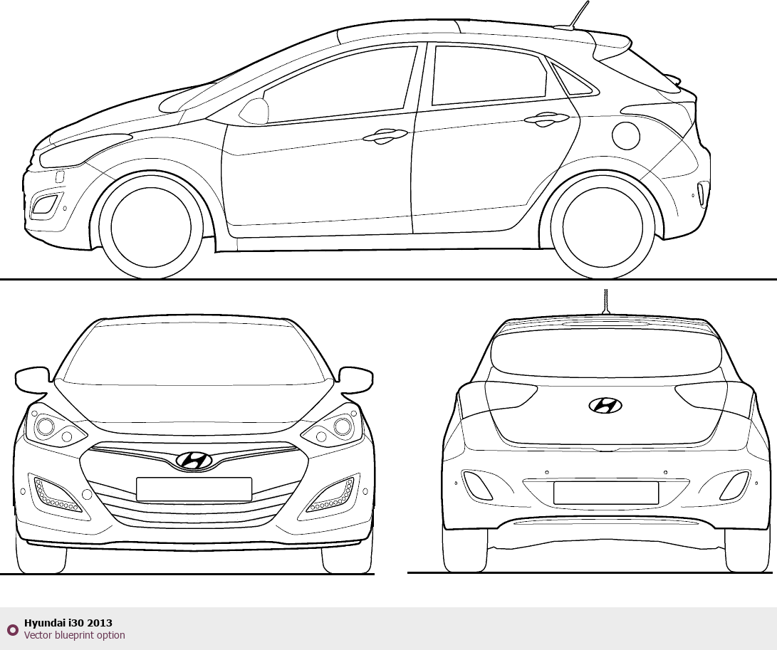 Raster blueprint of the 2013 Hyundai i30 Tag. This free downloadable image can be used for graphic projects, digital design, and 3D modeling. The file provides accurate exterior proportions of the vehicle. Model year: 2013. Body type: Tag.