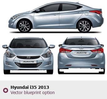 Raster blueprint of the 2013 Hyundai i35 Tag. This free downloadable image can be used for graphic projects, digital design, and 3D modeling. The file provides accurate exterior proportions of the vehicle. Model year: 2013. Body type: Tag.