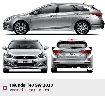 Raster blueprint of the 2013 Hyundai i40 SW Tag. This free downloadable image can be used for graphic projects, digital design, and 3D modeling. The file provides accurate exterior proportions of the vehicle. Model year: 2013. Body type: Tag.