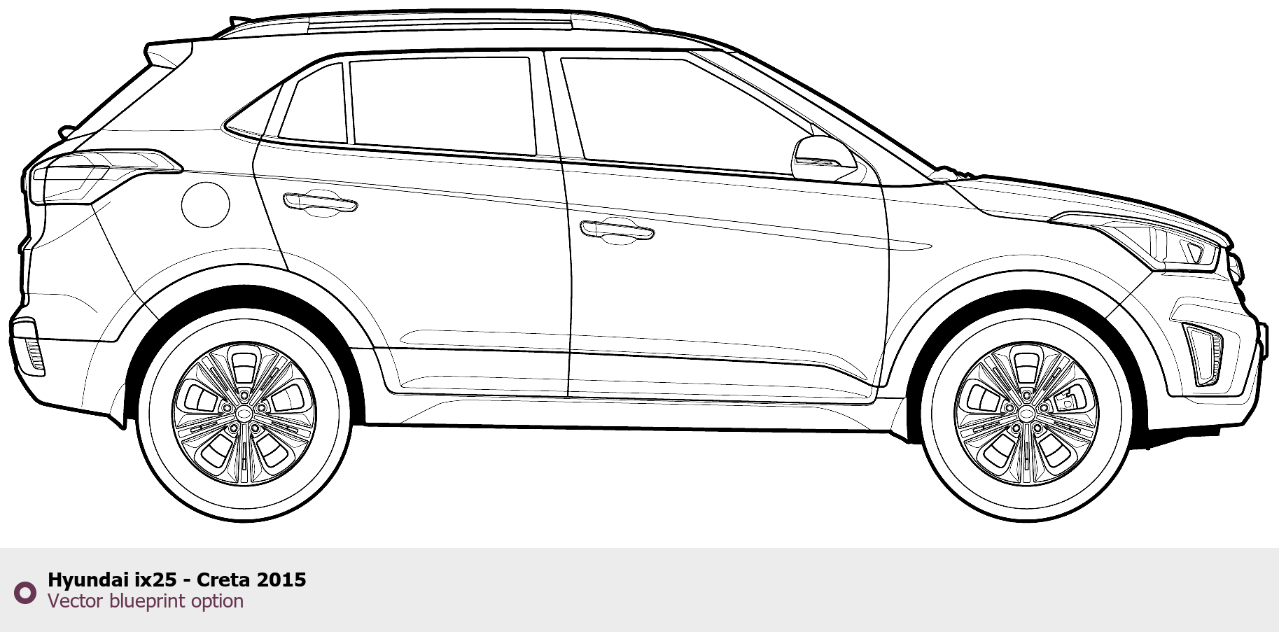 Raster blueprint of the 2015 Hyundai ix25 - Creta SUV. This free downloadable image can be used for graphic projects, digital design, and 3D modeling. The file provides accurate exterior proportions of the vehicle. Model year: 2015. Body type: SUV.