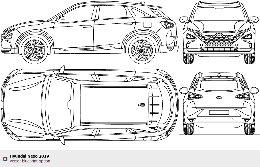 Raster blueprint of the 2019 Hyundai Nexo Tag. This free downloadable image can be used for graphic projects, digital design, and 3D modeling. The file provides accurate exterior proportions of the vehicle. Model year: 2019. Body type: Tag.