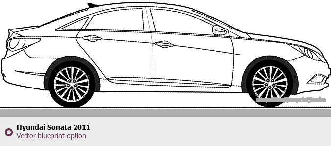 Raster blueprint of the 2011 Hyundai Sonata Sedan. This free downloadable image can be used for graphic projects, digital design, and 3D modeling. The file provides accurate exterior proportions of the vehicle. Model year: 2011. Body type: Sedan.