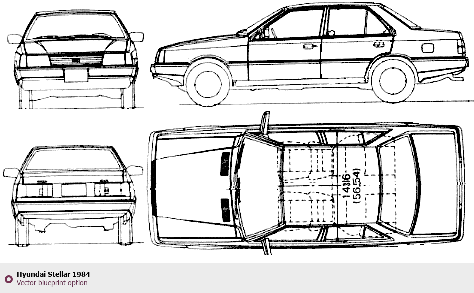Raster blueprint of the 1984 Hyundai Stellar Tag. This free downloadable image can be used for graphic projects, digital design, and 3D modeling. The file provides accurate exterior proportions of the vehicle. Model year: 1984. Body type: Tag.