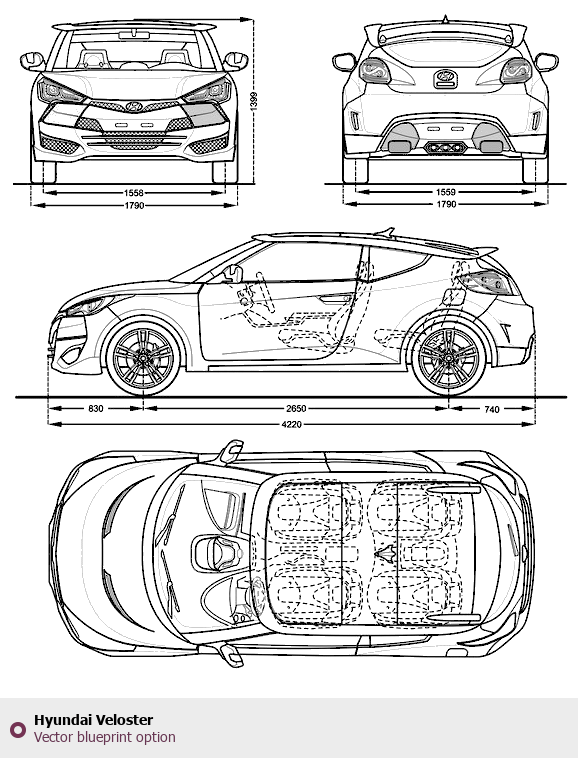 Raster blueprint of the Hyundai Veloster Coupe. This free downloadable image can be used for graphic projects, digital design, and 3D modeling. The file provides accurate exterior proportions of the vehicle. Body type: Coupe.
