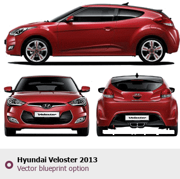 Raster blueprint of the 2013 Hyundai Veloster Coupe. This free downloadable image can be used for graphic projects, digital design, and 3D modeling. The file provides accurate exterior proportions of the vehicle. Model year: 2013. Body type: Coupe.
