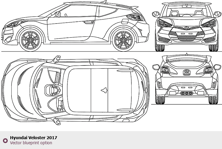 Raster blueprint of the 2017 Hyundai Veloster Coupe. This free downloadable image can be used for graphic projects, digital design, and 3D modeling. The file provides accurate exterior proportions of the vehicle. Model year: 2017. Body type: Coupe.
