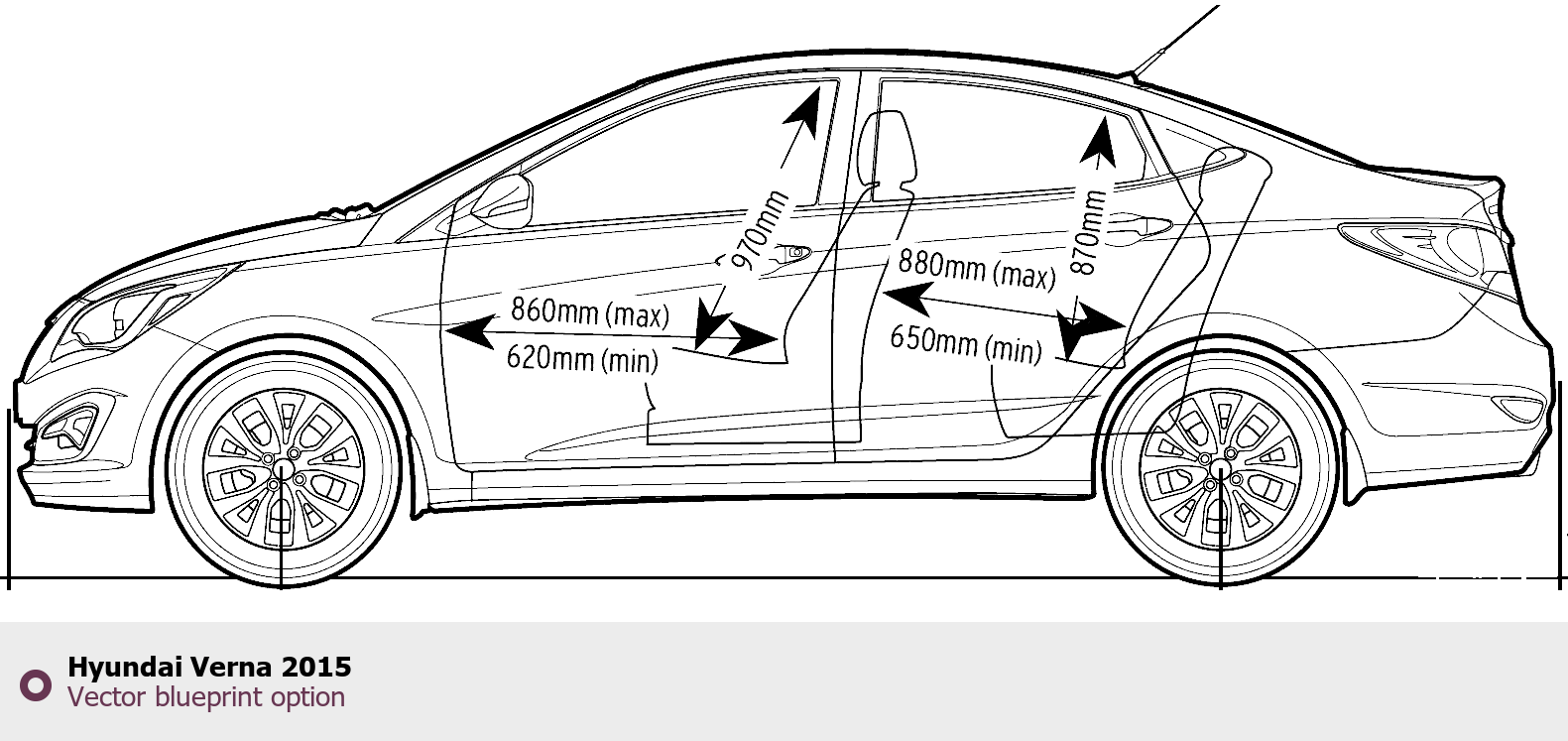 Raster blueprint of the 2015 Hyundai Verna Tag. This free downloadable image can be used for graphic projects, digital design, and 3D modeling. The file provides accurate exterior proportions of the vehicle. Model year: 2015. Body type: Tag.