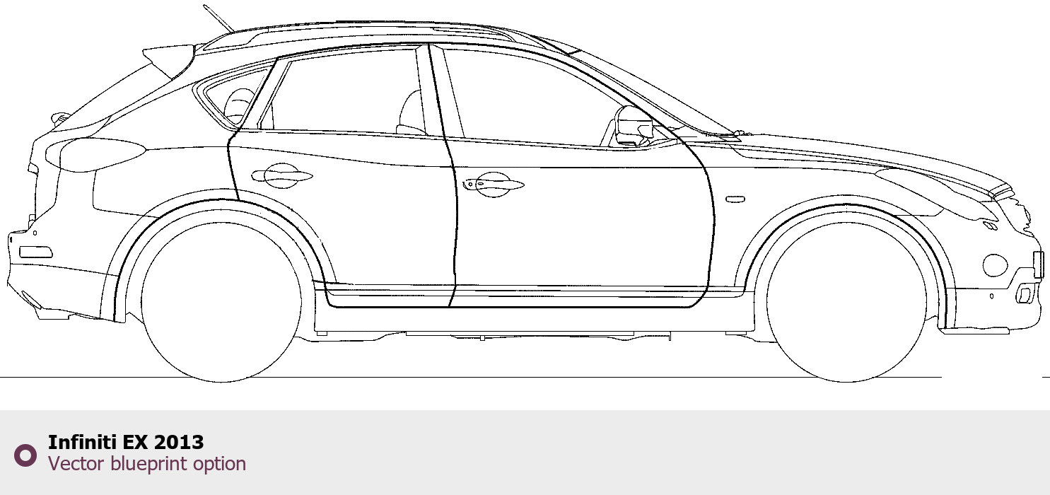 Raster blueprint of the 2013 Infiniti EX SUV. This free downloadable image can be used for graphic projects, digital design, and 3D modeling. The file provides accurate exterior proportions of the vehicle. Model year: 2013. Body type: SUV.