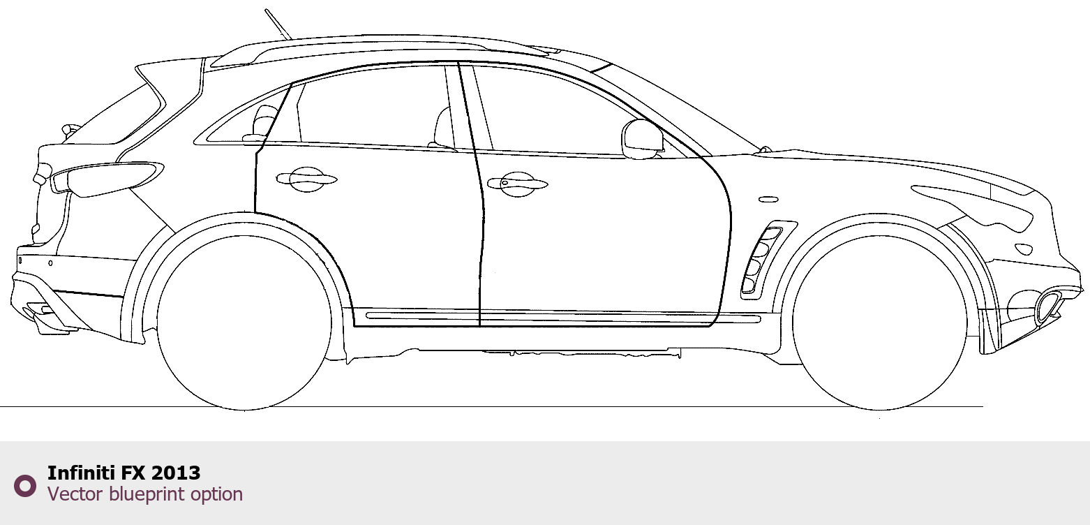 Raster blueprint of the 2013 Infiniti FX SUV. This free downloadable image can be used for graphic projects, digital design, and 3D modeling. The file provides accurate exterior proportions of the vehicle. Model year: 2013. Body type: SUV.