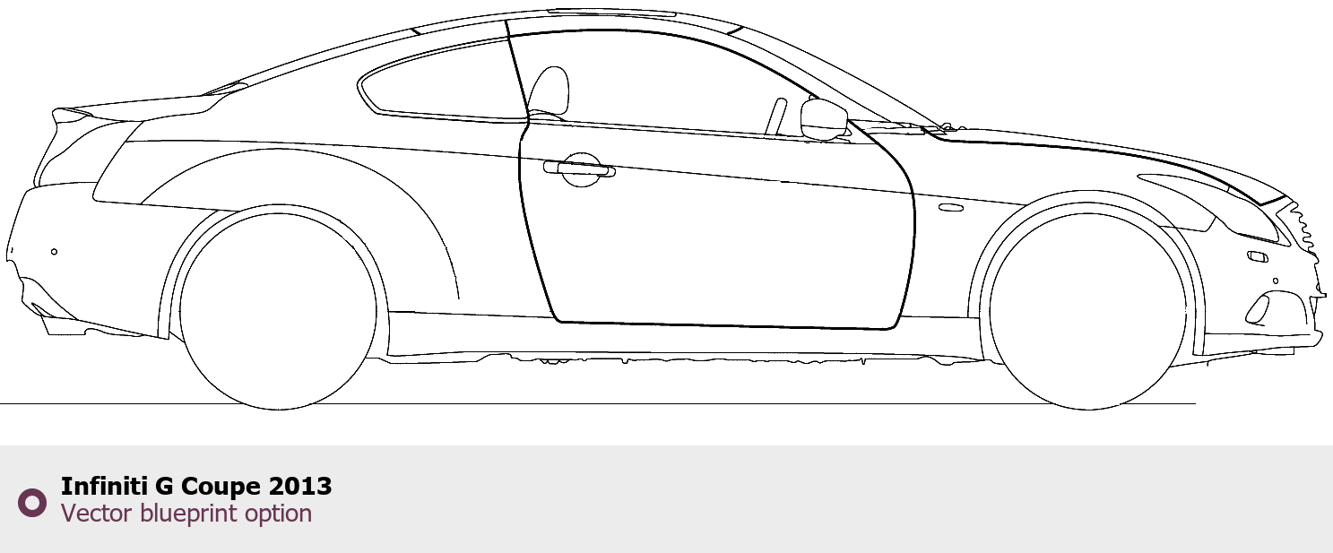 Raster blueprint of the 2013 Infiniti G Coupe Coupe. This free downloadable image can be used for graphic projects, digital design, and 3D modeling. The file provides accurate exterior proportions of the vehicle. Model year: 2013. Body type: Coupe.