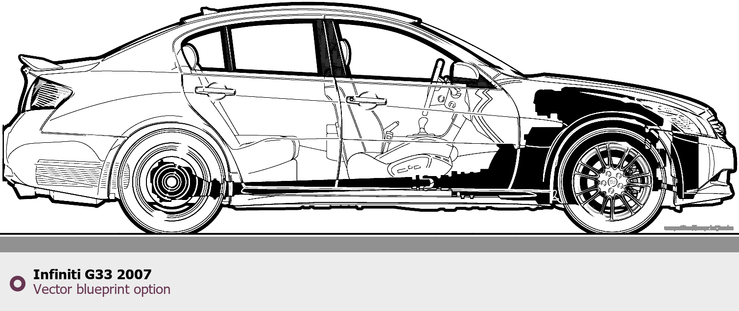 Raster blueprint of the 2007 Infiniti G33 Tag. This free downloadable image can be used for graphic projects, digital design, and 3D modeling. The file provides accurate exterior proportions of the vehicle. Model year: 2007. Body type: Tag.