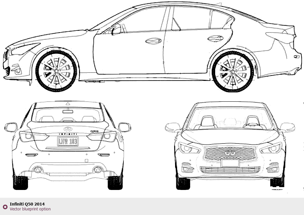 Raster blueprint of the 2014 Infiniti Q50 Sedan. This free downloadable image can be used for graphic projects, digital design, and 3D modeling. The file provides accurate exterior proportions of the vehicle. Model year: 2014. Body type: Sedan.