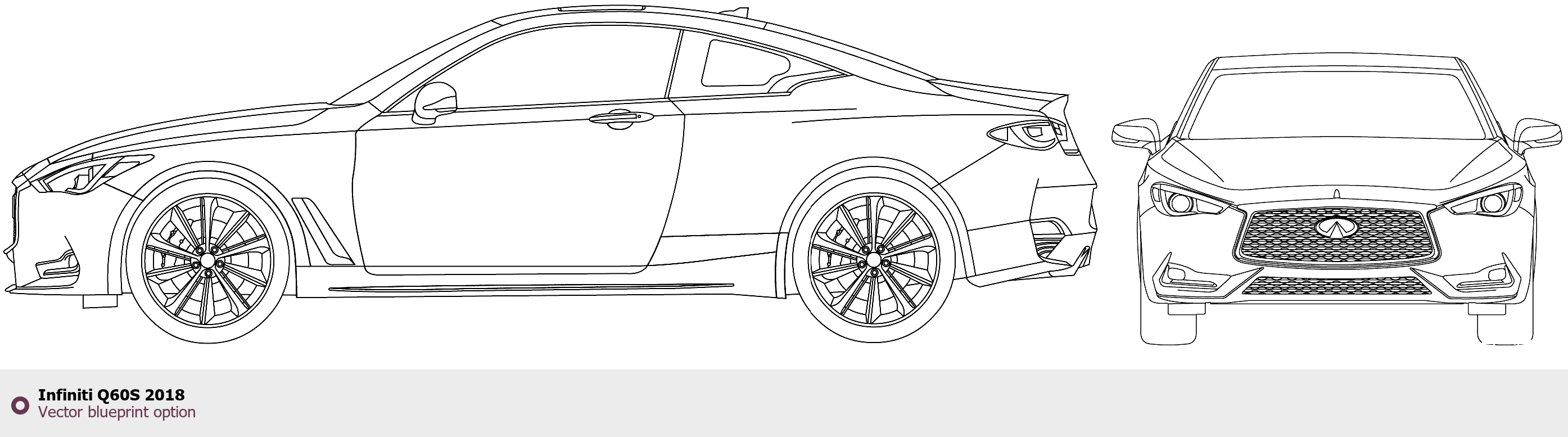Raster blueprint of the 2018 Infiniti Q60S Tag. This free downloadable image can be used for graphic projects, digital design, and 3D modeling. The file provides accurate exterior proportions of the vehicle. Model year: 2018. Body type: Tag.