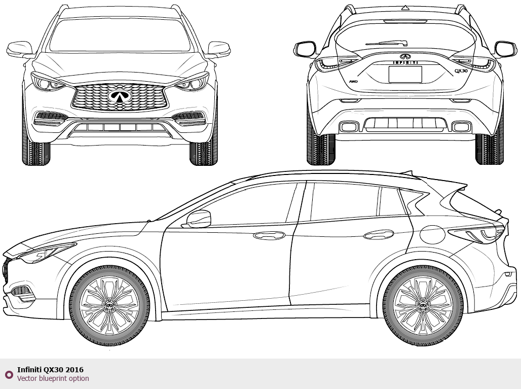Raster blueprint of the 2016 Infiniti QX30 Tag. This free downloadable image can be used for graphic projects, digital design, and 3D modeling. The file provides accurate exterior proportions of the vehicle. Model year: 2016. Body type: Tag.