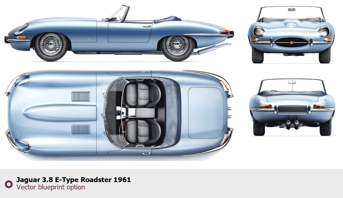 Raster blueprint of the 1961 Jaguar 3.8 E-Type Roadster Roadster. This free downloadable image can be used for graphic projects, digital design, and 3D modeling. The file provides accurate exterior proportions of the vehicle. Model year: 1961. Body type: Roadster.
