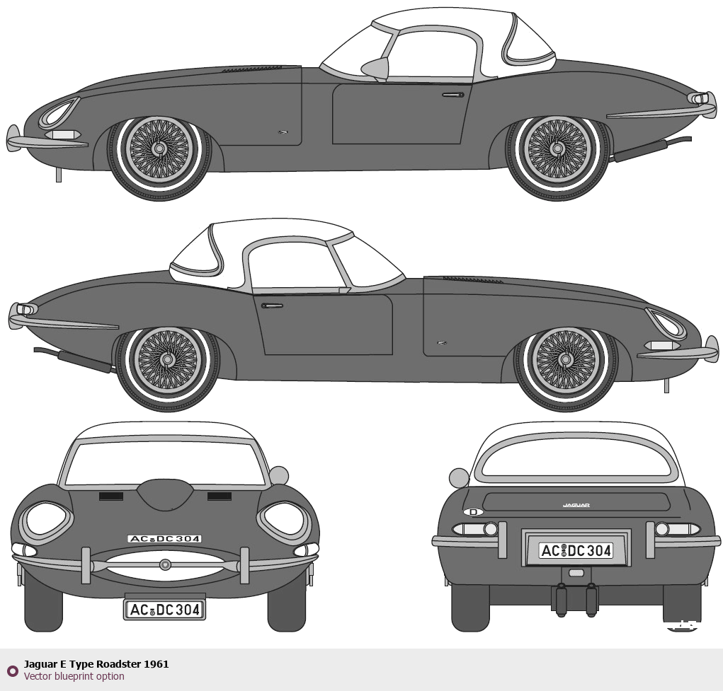 Raster blueprint of the 1961 Jaguar E Type Roadster Roadster. This free downloadable image can be used for graphic projects, digital design, and 3D modeling. The file provides accurate exterior proportions of the vehicle. Model year: 1961. Body type: Roadster.