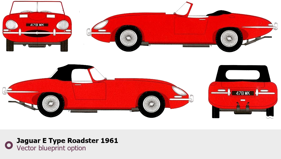 Raster blueprint of the 1961 Jaguar E Type Roadster Roadster. This free downloadable image can be used for graphic projects, digital design, and 3D modeling. The file provides accurate exterior proportions of the vehicle. Model year: 1961. Body type: Roadster.