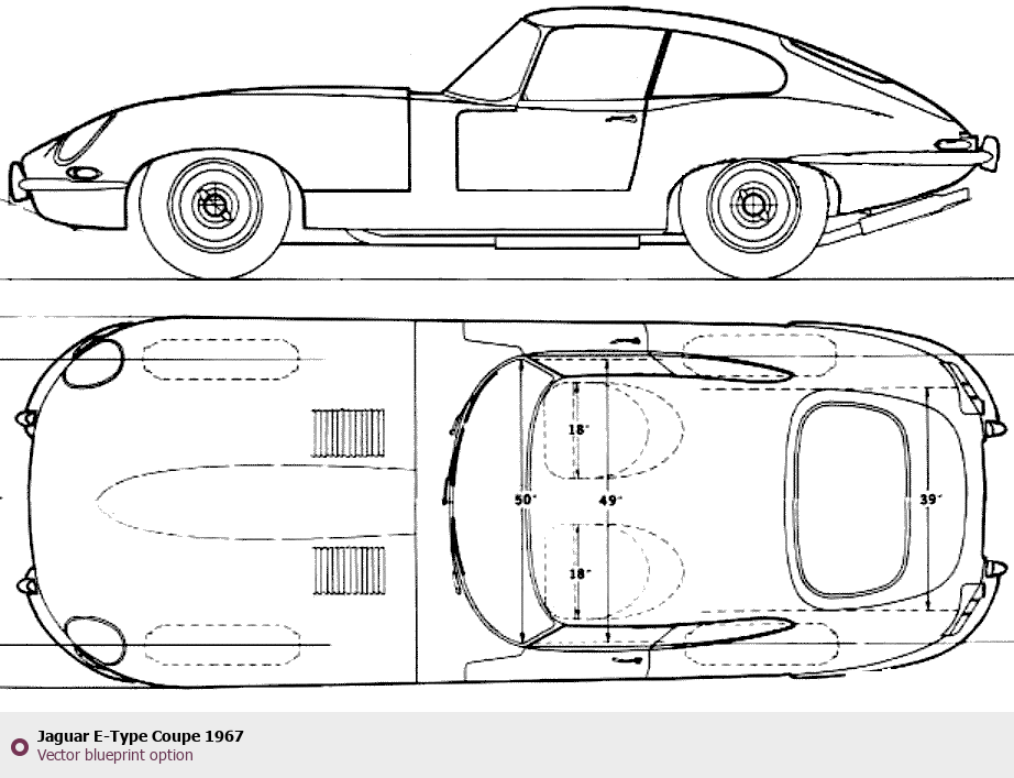 Raster blueprint of the 1967 Jaguar E-Type Coupe Coupe. This free downloadable image can be used for graphic projects, digital design, and 3D modeling. The file provides accurate exterior proportions of the vehicle. Model year: 1967. Body type: Coupe.