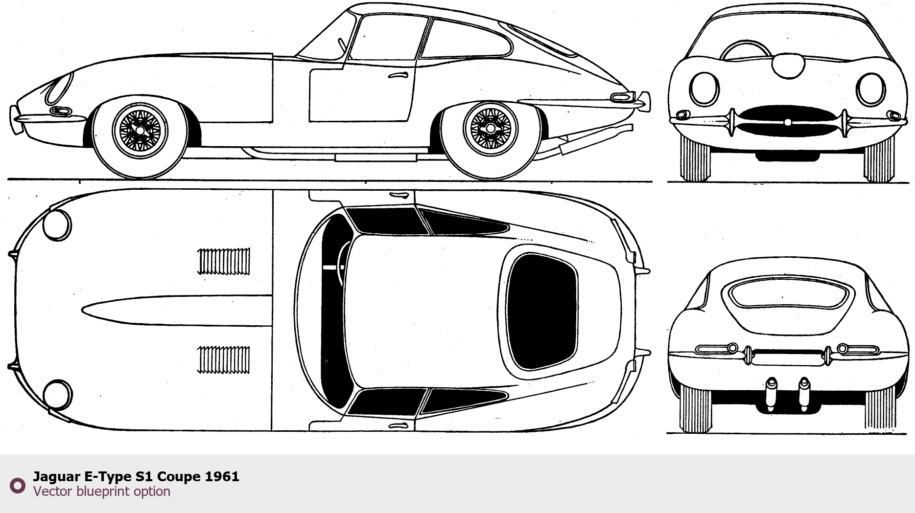 Raster blueprint of the 1961 Jaguar E-Type S1 Coupe Coupe. This free downloadable image can be used for graphic projects, digital design, and 3D modeling. The file provides accurate exterior proportions of the vehicle. Model year: 1961. Body type: Coupe.