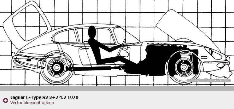 Raster blueprint of the 1970 Jaguar E-Type S2 2+2 4.2 Coupe. This free downloadable image can be used for graphic projects, digital design, and 3D modeling. The file provides accurate exterior proportions of the vehicle. Model year: 1970. Body type: Coupe.