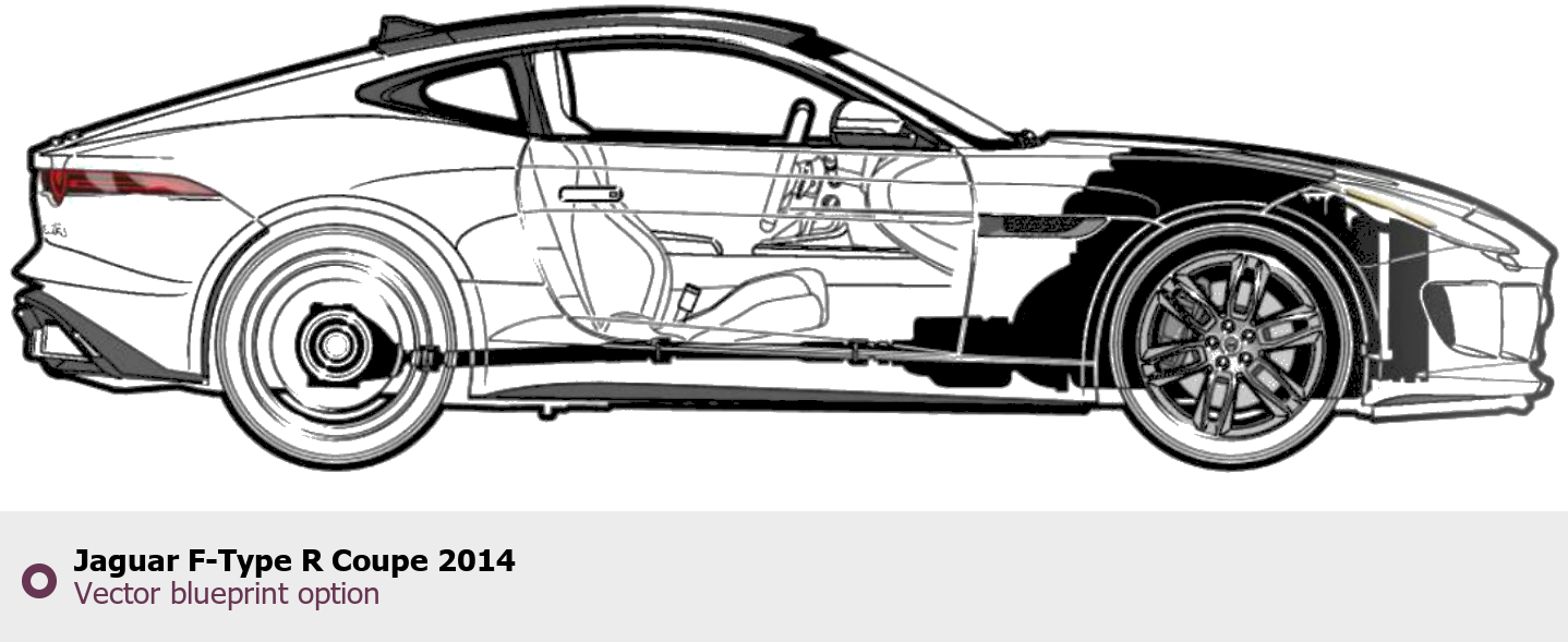 Raster blueprint of the 2014 Jaguar F-Type R Coupe Coupe. This free downloadable image can be used for graphic projects, digital design, and 3D modeling. The file provides accurate exterior proportions of the vehicle. Model year: 2014. Body type: Coupe.