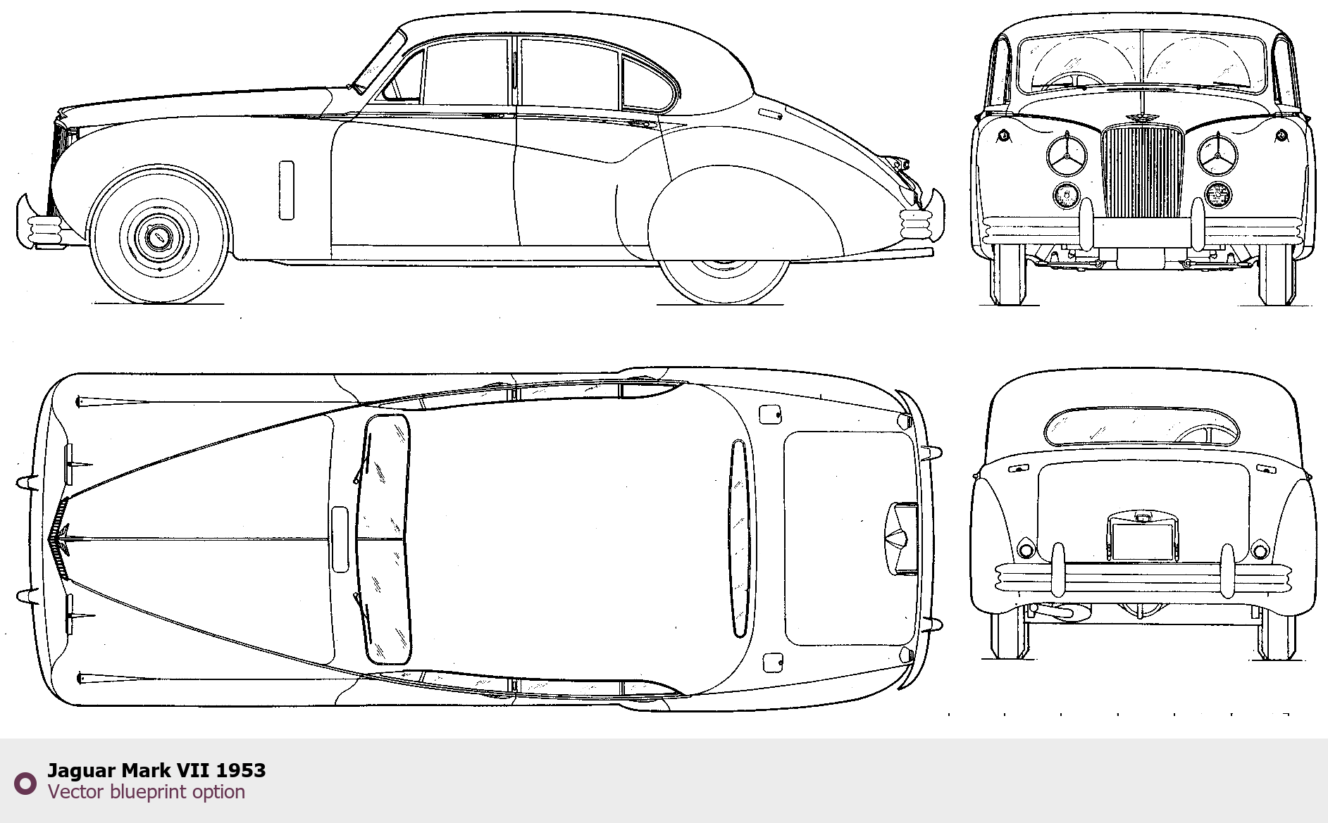Raster blueprint of the 1953 Jaguar Mark VII Tag. This free downloadable image can be used for graphic projects, digital design, and 3D modeling. The file provides accurate exterior proportions of the vehicle. Model year: 1953. Body type: Tag.