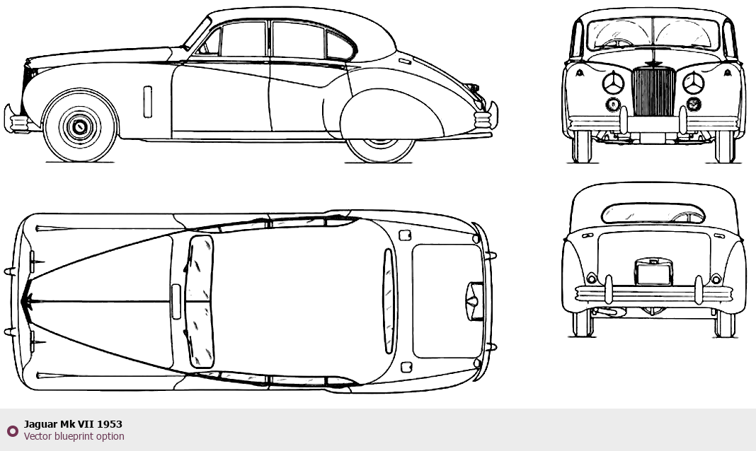 Raster blueprint of the 1953 Jaguar Mk VII Sedan. This free downloadable image can be used for graphic projects, digital design, and 3D modeling. The file provides accurate exterior proportions of the vehicle. Model year: 1953. Body type: Sedan.