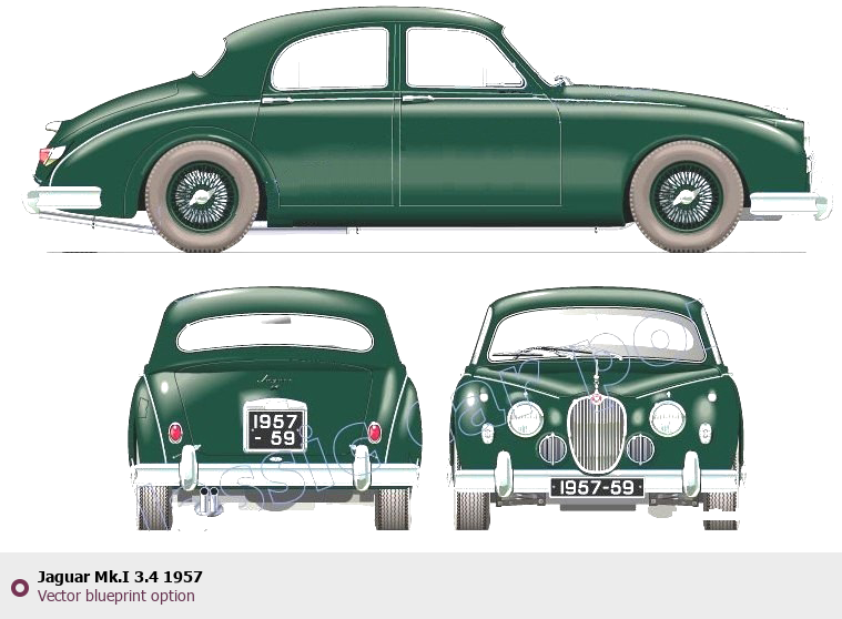 Raster blueprint of the 1957 Jaguar Mk.I 3.4 Tag. This free downloadable image can be used for graphic projects, digital design, and 3D modeling. The file provides accurate exterior proportions of the vehicle. Model year: 1957. Body type: Tag.