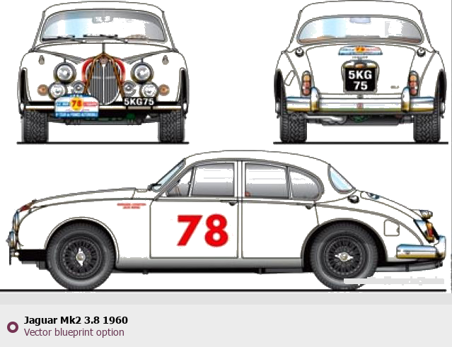Raster blueprint of the 1960 Jaguar Mk2 3.8 Tag. This free downloadable image can be used for graphic projects, digital design, and 3D modeling. The file provides accurate exterior proportions of the vehicle. Model year: 1960. Body type: Tag.