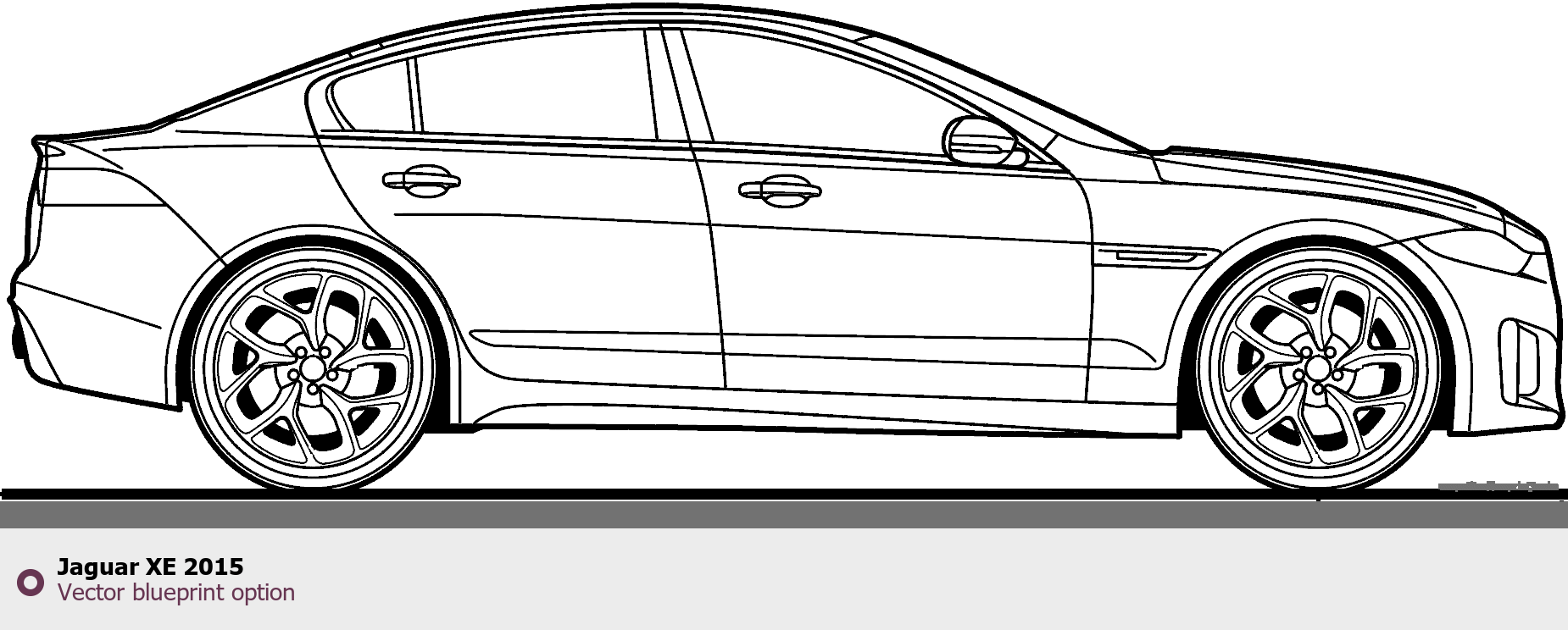 Raster blueprint of the 2015 Jaguar XE Sedan. This free downloadable image can be used for graphic projects, digital design, and 3D modeling. The file provides accurate exterior proportions of the vehicle. Model year: 2015. Body type: Sedan.