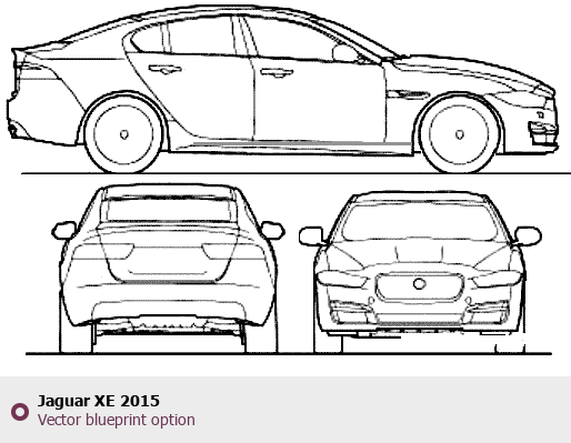 Raster blueprint of the 2015 Jaguar XE Sedan. This free downloadable image can be used for graphic projects, digital design, and 3D modeling. The file provides accurate exterior proportions of the vehicle. Model year: 2015. Body type: Sedan.