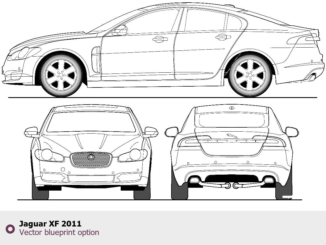 Raster blueprint of the 2011 Jaguar XF Tag. This free downloadable image can be used for graphic projects, digital design, and 3D modeling. The file provides accurate exterior proportions of the vehicle. Model year: 2011. Body type: Tag.