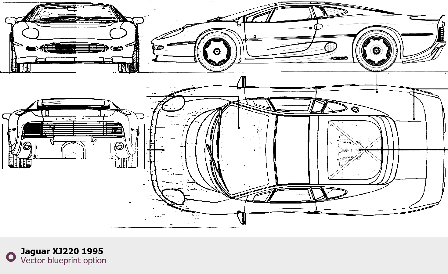Raster blueprint of the 1995 Jaguar XJ220 Sedan. This free downloadable image can be used for graphic projects, digital design, and 3D modeling. The file provides accurate exterior proportions of the vehicle. Model year: 1995. Body type: Sedan.