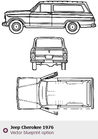 Raster blueprint of the 1976 Jeep Cherokee SUV. This free downloadable image can be used for graphic projects, digital design, and 3D modeling. The file provides accurate exterior proportions of the vehicle. Model year: 1976. Body type: SUV.