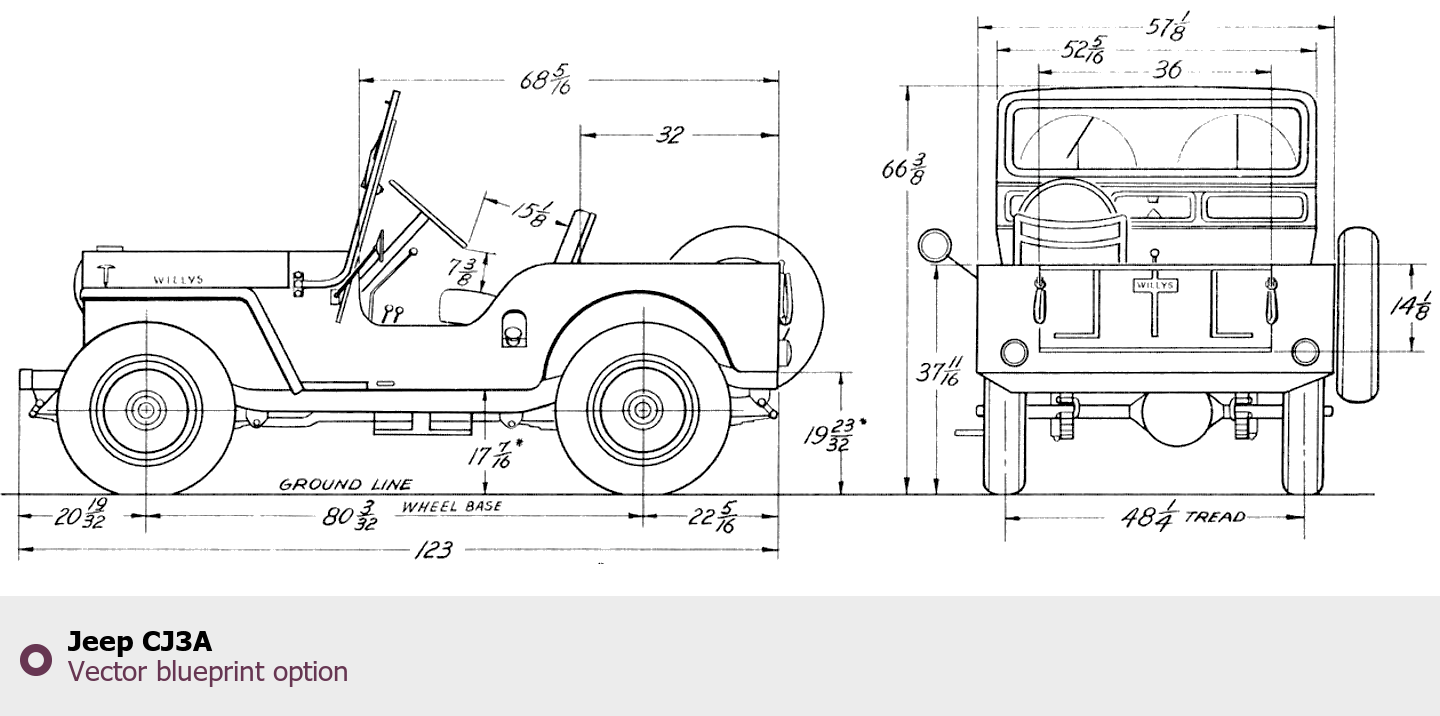 Raster blueprint of the Jeep CJ3A SUV. This free downloadable image can be used for graphic projects, digital design, and 3D modeling. The file provides accurate exterior proportions of the vehicle. Body type: SUV.
