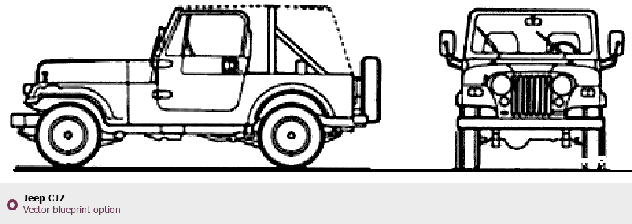 Raster blueprint of the Jeep CJ7 SUV. This free downloadable image can be used for graphic projects, digital design, and 3D modeling. The file provides accurate exterior proportions of the vehicle. Body type: SUV.
