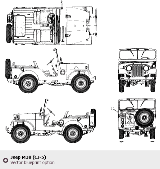 Raster blueprint of the Jeep M38 (CJ-5) SUV. This free downloadable image can be used for graphic projects, digital design, and 3D modeling. The file provides accurate exterior proportions of the vehicle. Body type: SUV.