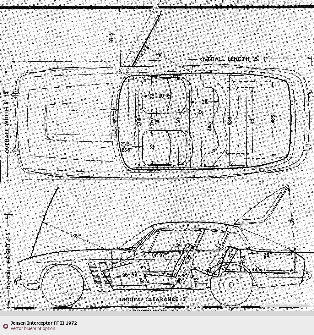 Raster blueprint of the 1972 Jensen Interceptor FF II Tag. This free downloadable image can be used for graphic projects, digital design, and 3D modeling. The file provides accurate exterior proportions of the vehicle. Model year: 1972. Body type: Tag.