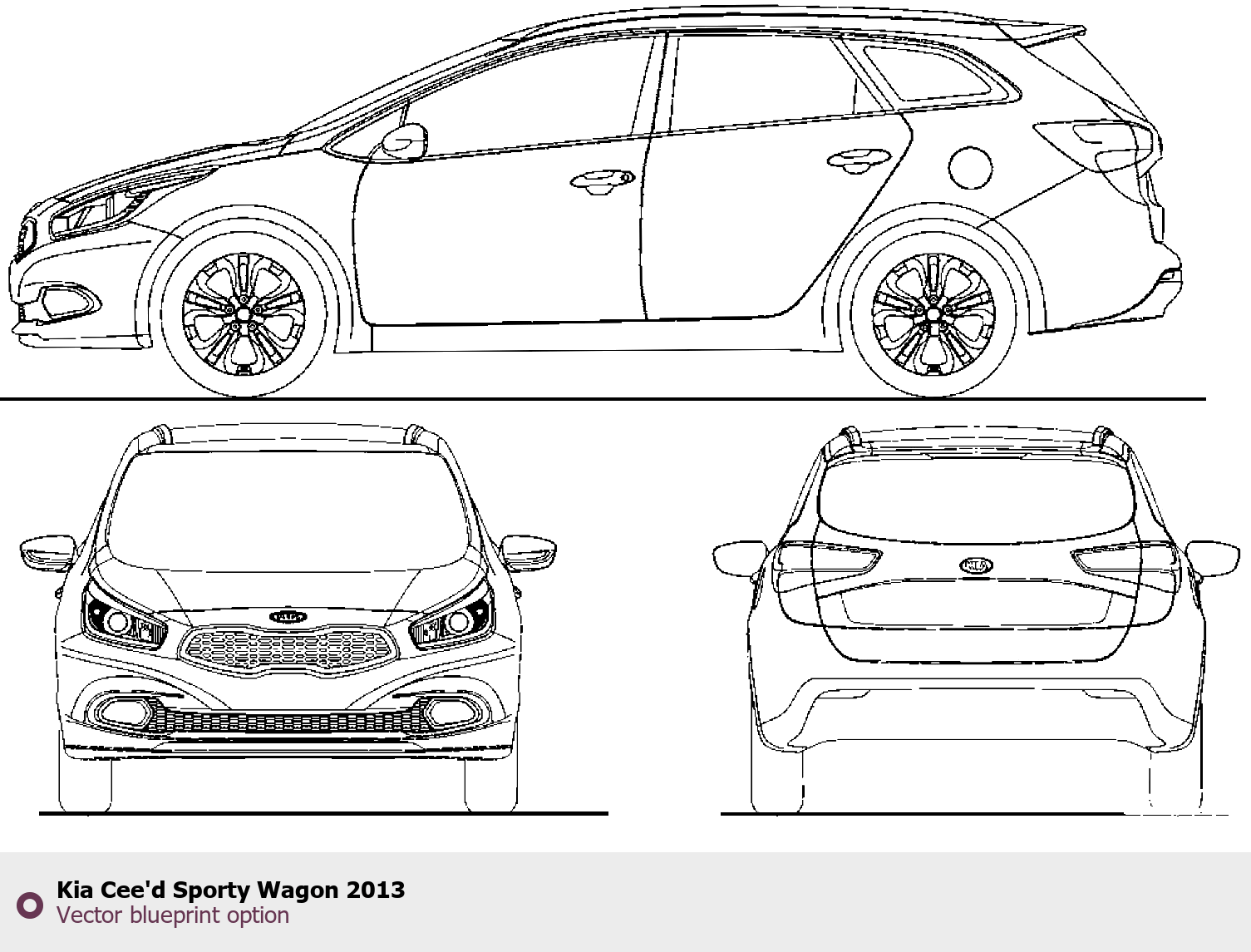 Raster blueprint of the 2013 KIA Cee'd Sporty Wagon Wagon. This free downloadable image can be used for graphic projects, digital design, and 3D modeling. The file provides accurate exterior proportions of the vehicle. Model year: 2013. Body type: Wagon.