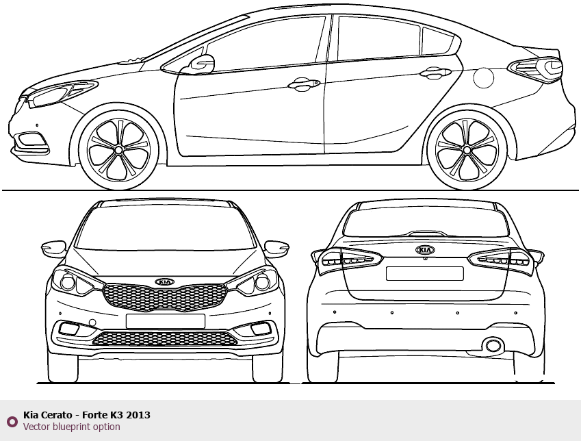 Raster blueprint of the 2013 KIA Cerato - Forte K3 Tag. This free downloadable image can be used for graphic projects, digital design, and 3D modeling. The file provides accurate exterior proportions of the vehicle. Model year: 2013. Body type: Tag.