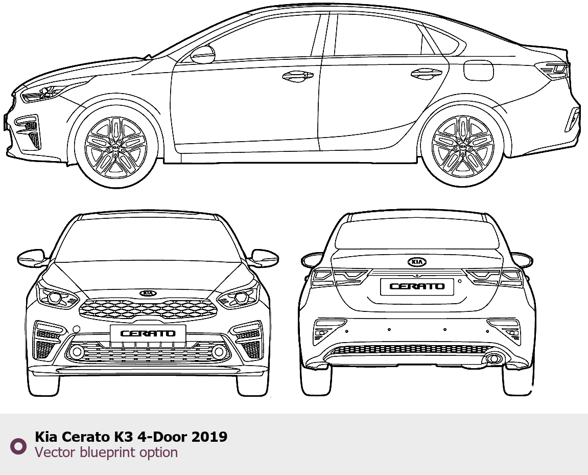 Raster blueprint of the 2019 KIA Cerato K3 4-Door Tag. This free downloadable image can be used for graphic projects, digital design, and 3D modeling. The file provides accurate exterior proportions of the vehicle. Model year: 2019. Body type: Tag.
