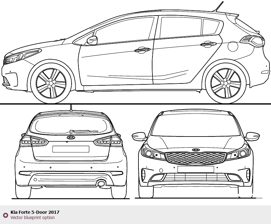 Raster blueprint of the 2017 KIA Forte 5-Door Tag. This free downloadable image can be used for graphic projects, digital design, and 3D modeling. The file provides accurate exterior proportions of the vehicle. Model year: 2017. Body type: Tag.
