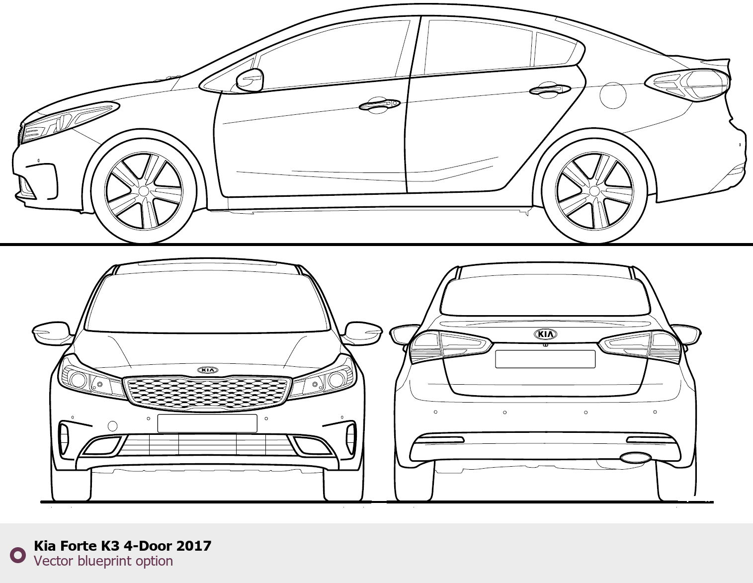 Raster blueprint of the 2017 KIA Forte K3 4-Door Tag. This free downloadable image can be used for graphic projects, digital design, and 3D modeling. The file provides accurate exterior proportions of the vehicle. Model year: 2017. Body type: Tag.
