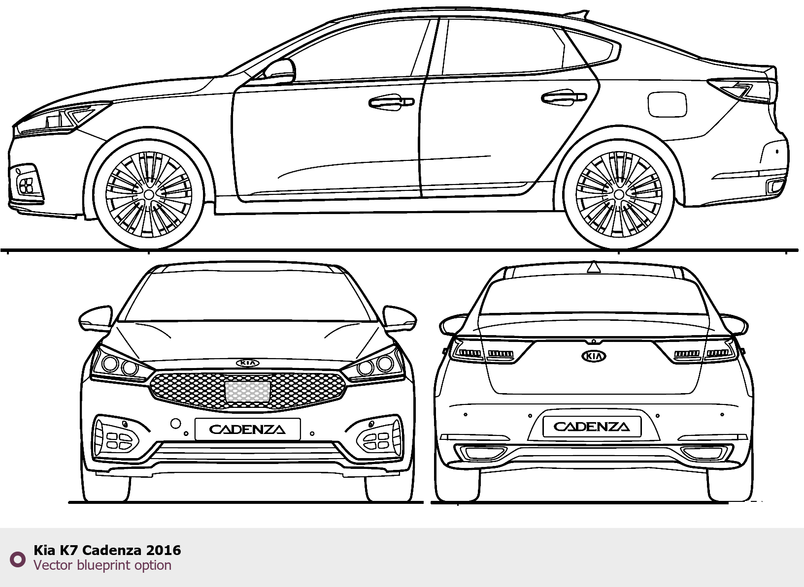 Raster blueprint of the 2016 KIA K7 Cadenza Tag. This free downloadable image can be used for graphic projects, digital design, and 3D modeling. The file provides accurate exterior proportions of the vehicle. Model year: 2016. Body type: Tag.