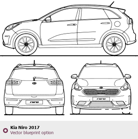 Raster blueprint of the 2017 KIA Niro Tag. This free downloadable image can be used for graphic projects, digital design, and 3D modeling. The file provides accurate exterior proportions of the vehicle. Model year: 2017. Body type: Tag.
